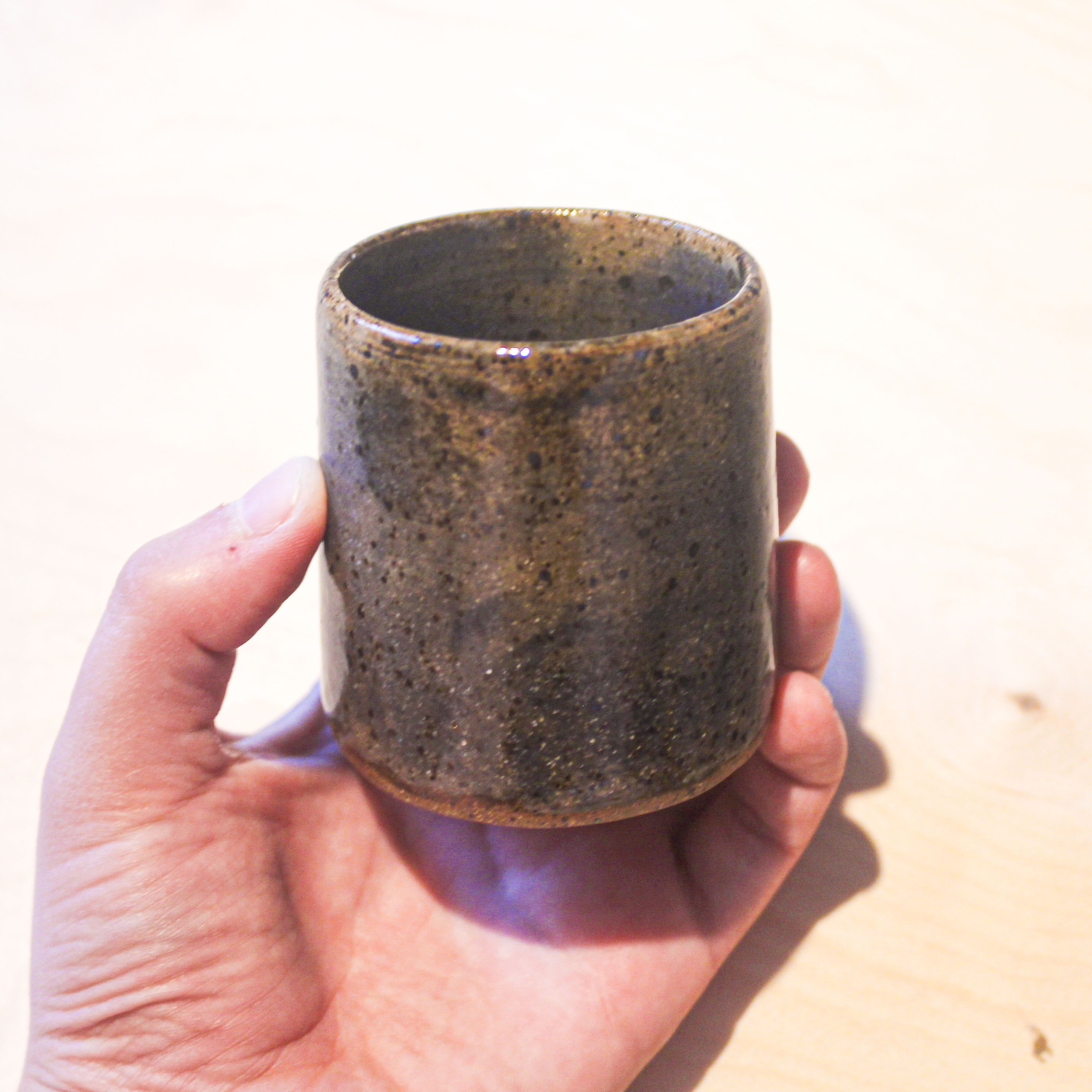 this a-line cup’s blue interior is hidden by a sponged texture brown exterior